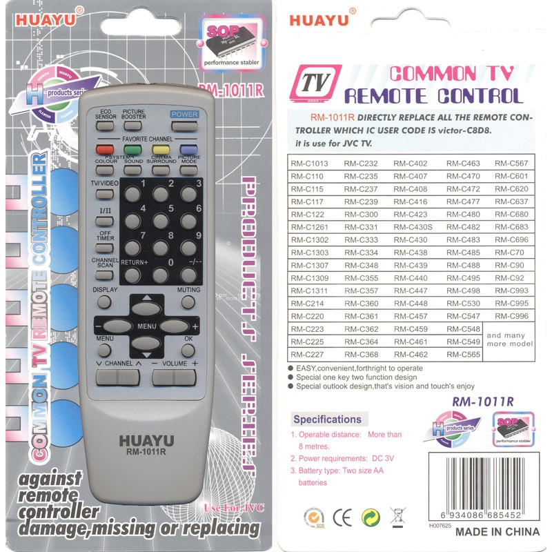 Универсальный пульт Huayu для JVC RM-1011R изготовлен из качественных материалов и прошел проверку по сертификации CE. Сертификат соответствия СЕ – это международный сертификат соответствия Директивам Объединенной Европы. Поэтому этот пульт никогда вас не подведет!